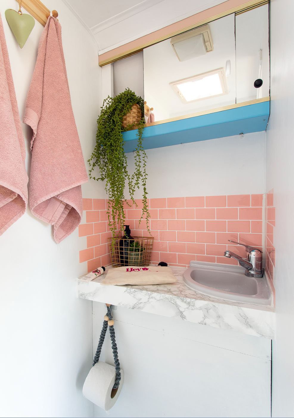 The colourful fairy lights are from Cable Cotton and the ceramic door handles are from Rinkit. The stick on tiles behind the sink in the kitchen and the bathroom are from Dunelm.