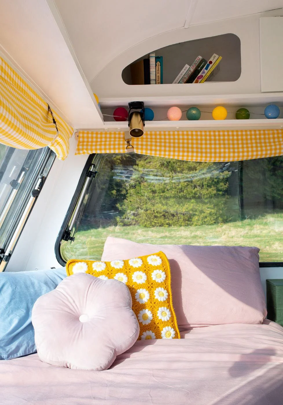 The caravan was in poor condition when they bought it, David had to completely dismantle it to restore it, but they were pleased to preserve lots of original features for the authentic look they wanted and to create a fabulous, colourful environment which honestly offers every comfort you could wish for!