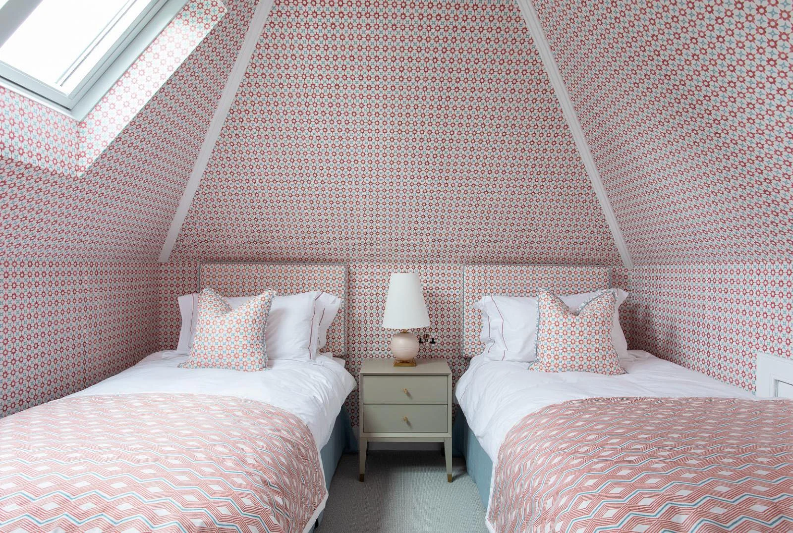 A beautiful twin bedroom in a turreted attic room.