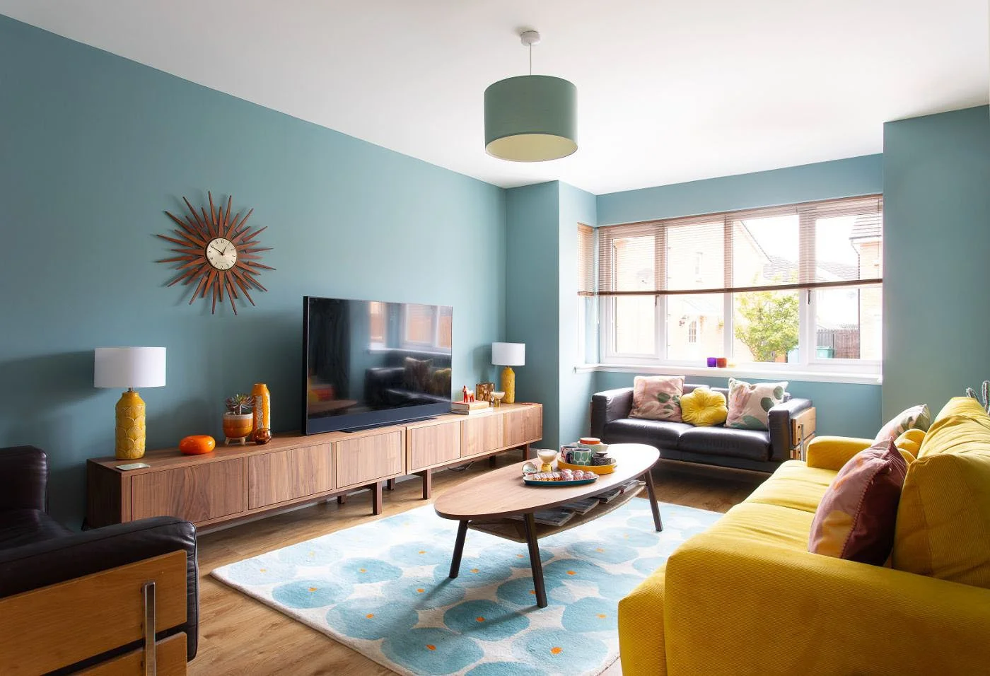 The walls in the master bedroom are painted in ‘Wintery Tide’ by Leyland Paints. Julie has chosen a matching teal pendant light and vibrant yellow velvet cushions, quilted throw and bedside lights for contrast and drama. The prints behind the bed are by Inaluxe that Julie has popped into Ikea Ribba frames. The yellow industrial style bedside lights were from ebay. The round yellow cushions are from Dunelm and the mustard ANYDAY quilted throw is from John Lewis.