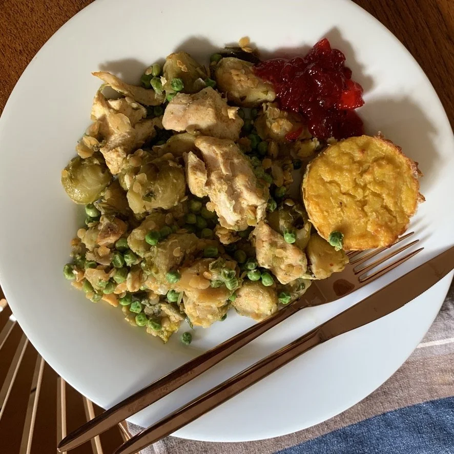 Here, I combined a mid-morning snack, a sweetcorn muffin with a 'lunch' and added some of my own home made redcurrant and apple jelly and some frozen peas.