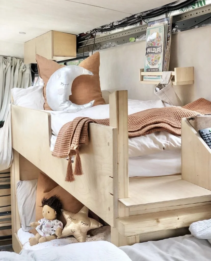 Before they embarked on this project River was a graphic designer, working for a company who manufactured super yachts, creating logos, signage and bespoke fittings. Despite his expert design skills, he had no real DIY experience: they were living in a rented home where he had no need to even hang a picture. However, he bought this bus, for £8,000 with it’s distinctly unromantic interior and has transformed it over the course of 16 months, into the most stunning scandi style family home, doing everything himself on a budget of around £13,000.