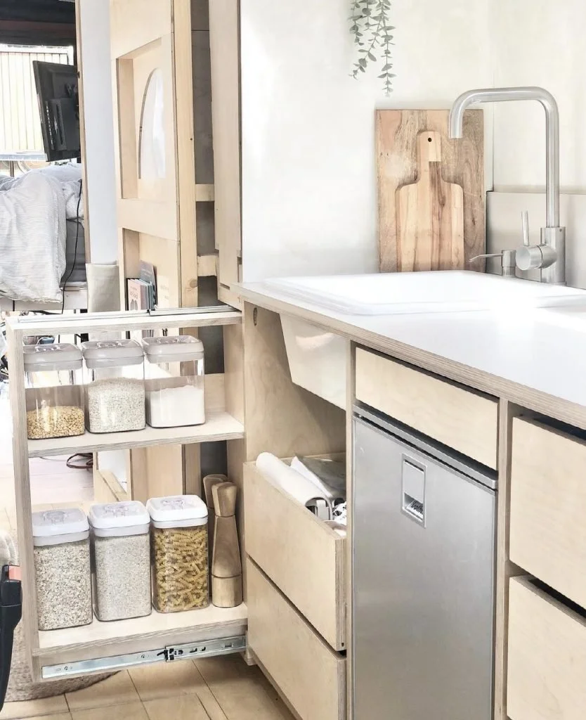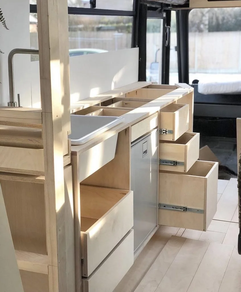 River designed and built the bespoke plywood fittings. We bought a cream vintage style cooker on eBay for £60, it is absolutely perfect and a very smart stainless steel fridge for the full price of £600. There is no dishwasher, nor do we have a washing machine, we will use the washing machines available on the campsites.